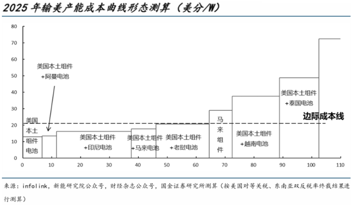 国金证券在研报中分析,本轮对等关税几乎针对所有非美光伏电池片产区,全球供美产能格局发生显著变化,成本曲线进一步陡峭。随着非美产能增加关税、美国本土产能获得IRA补贴,虽然美国各类关税、补贴政策的最终目的是使供美产能成本曲线的分布形态从低到高呈现为: