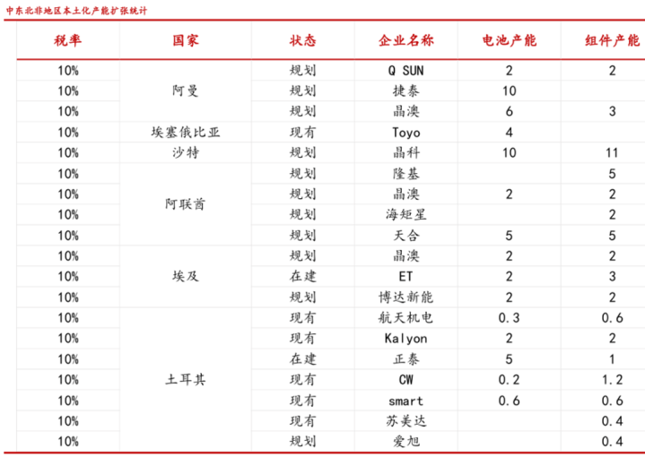 目前,中东北非地区本土化产能正快速扩张,包括阿曼在内,上述地区在建电池产能已达50GW,可基本满足美国市场需求。另外,埃及(如博达新能项目)、埃塞俄比亚(Toyo项目)、土耳其等地的优势也在显现出来。