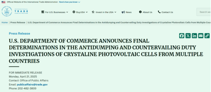4月21日,美国商务部宣布对东南亚四国——柬埔寨、马来西亚、泰国、越南太阳能电池最终的肯定性裁定,将征收创纪录的高额“反倾销税(AD)”和“反补贴税(CVD)”。